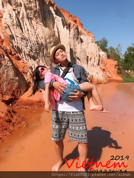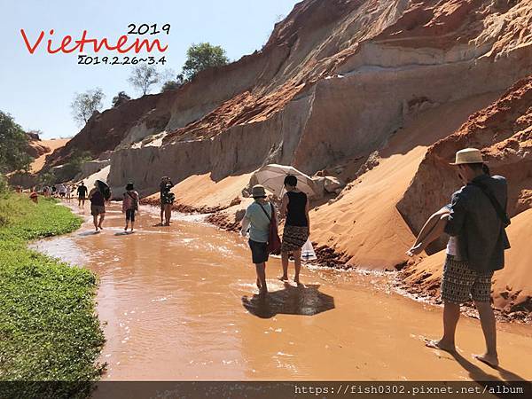 我們買了門票後就赤腳進入仙女溪了。這裡的景色真的很特別,小溪的水只到腳踝,泥沙是細的,但偶而有樹枝或石頭等天然小雜物,所以行走時也要很小心,抬頭看,一面是火紅的峭壁,這樣的風景我是第一次親眼看過。仙女溪去跟回是同一條路,這樣走下來大概30分鐘-40分鐘。