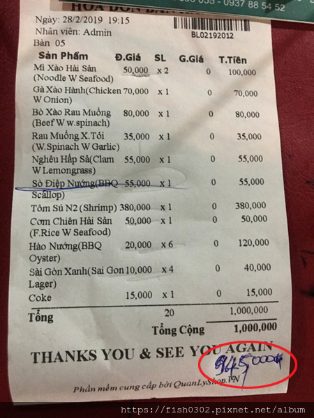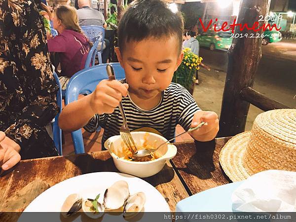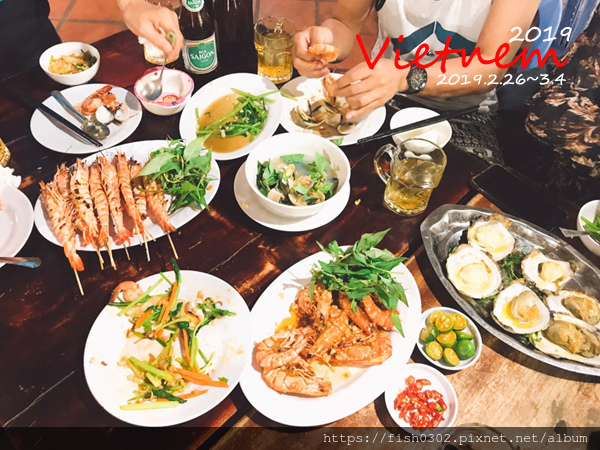 在美奈大啖海鮮是必要的行程,美奈是漁村,每天都有漁船出海捕魚,所以這邊的海鮮新鮮又便宜,已先上網找了這家評價不錯的餐廳,我們點了一斤蝦子,一半用烤的一半用炒的,6顆大鮮蚵,炒河蠣,海鮮炒河粉兩大盤,炒飯一大盤,炒青菜,三瓶啤酒,飲料這樣滿滿一桌,5大2小吃好飽才台幣1350元。